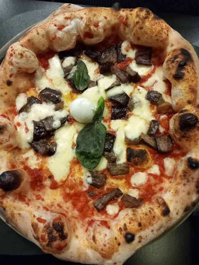 - Pomodoro schiacciato a mano, provola affumicata dei monti, nduja calabrese, salsiccia napoletana, olio evo e basilico