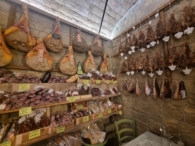 I nostri pregiati prosciutti e salumi affinati di razze antiche e brade accompagnati da fette di pizzotto ghiotto umbro, tomino stagionato sott'olio al tartufo, peperoncino con tonno capperi e acciughe: salame, salsiccette, capocollo, ciauscolo, culatello di grotta, crudi, guanciale ecc.