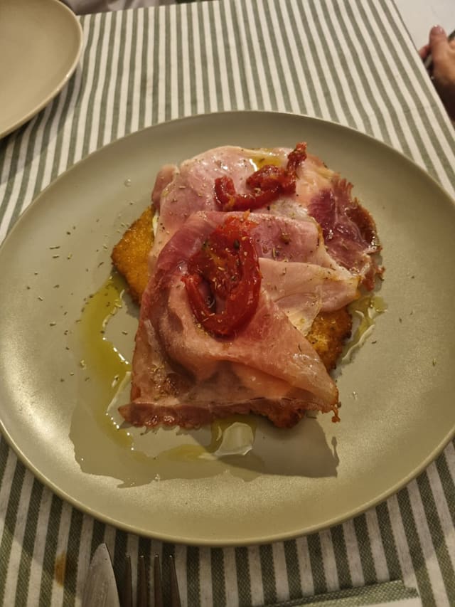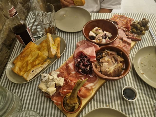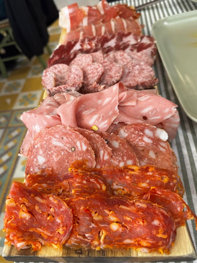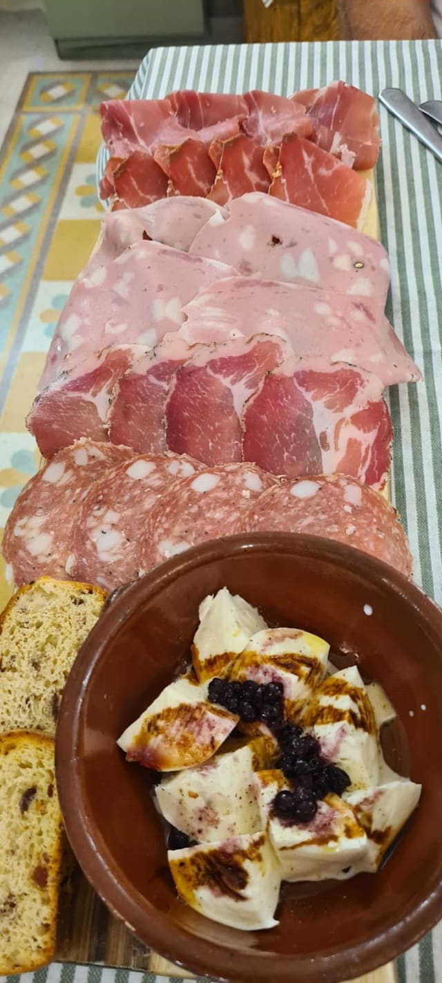 Crudo dolce 30 mesi, crudo saporito valnerino, mortadella di cinghiale al tartufo, salume contadino, lonzino di brado, bufala alla volpetti (con frutti di bosco, tre pepi macinati freschi, olio EVO nostro e balsamico bio), accompagnati da fette di pizzotto ghiotto umbro.