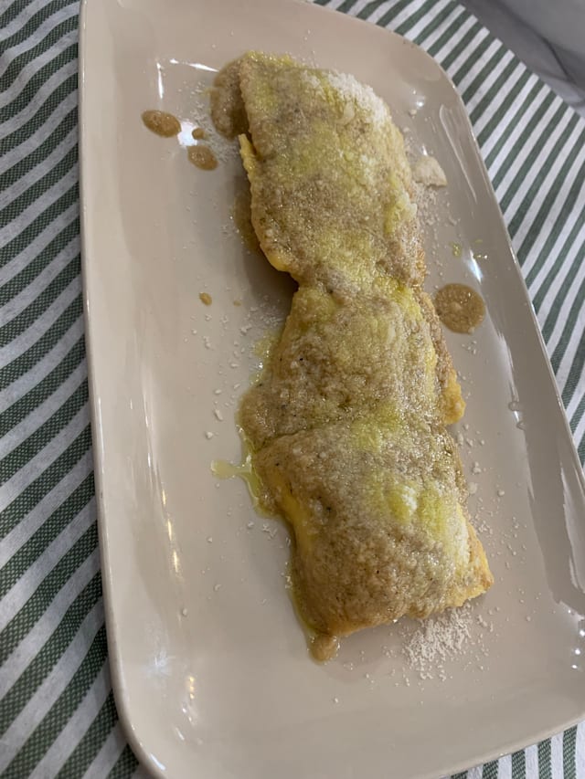 (ripieni con ricotta di pecora, mucca, capra) ripassati con salsa rustica di pomodori dell'orto, olio EVO nostro, basilico fresco, reggiano 48 mesi. Sughi e pasta con trafila di bronzo fatti in casa