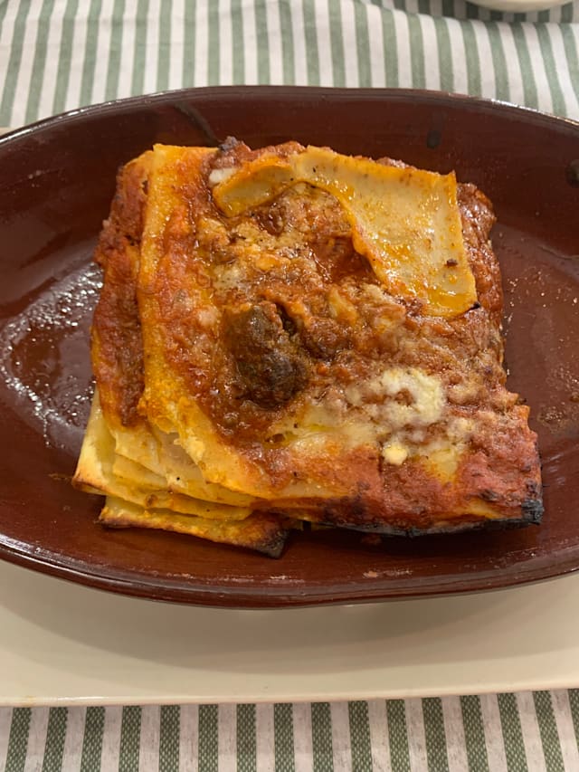 Ragù bianco preparato con gli animali di cortile: pollo, anatra, faraona, suino, odori dell'orto e pecorino romano riserva 16 mesi manto nero.