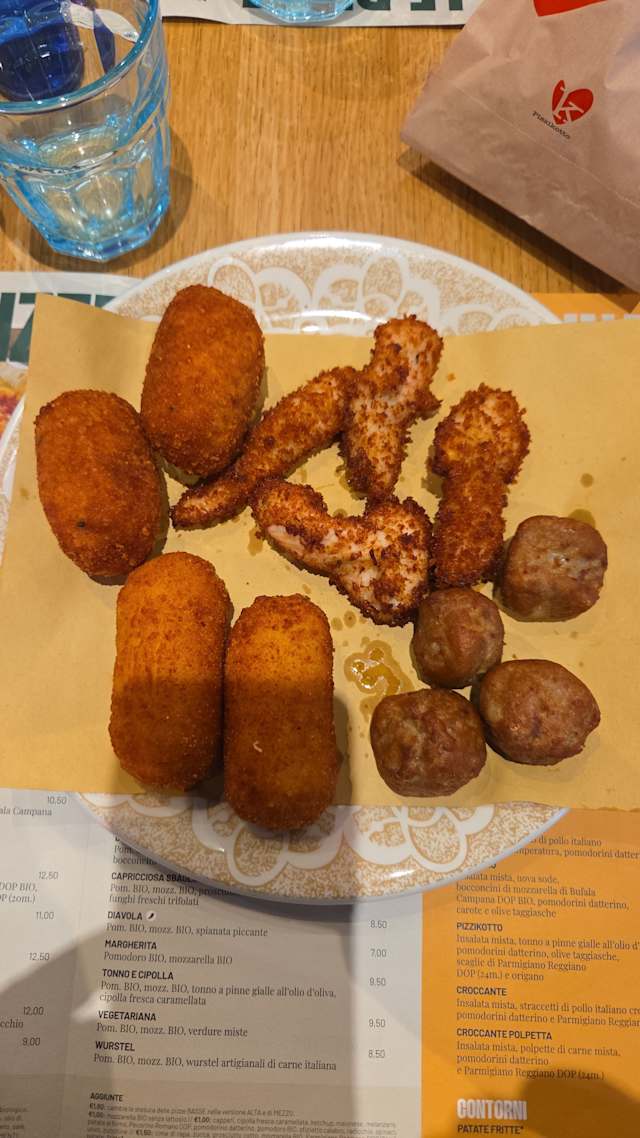 - Supplì (2pz.), crocchette di patate (2pz.), filetti di pollo croccanti (4pz.), polpette di carne mista (4pz.)