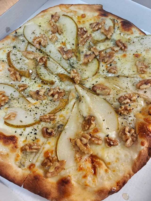 - Mozzarella y nata de base con pera, queso gorgonzola, nueces y miel
