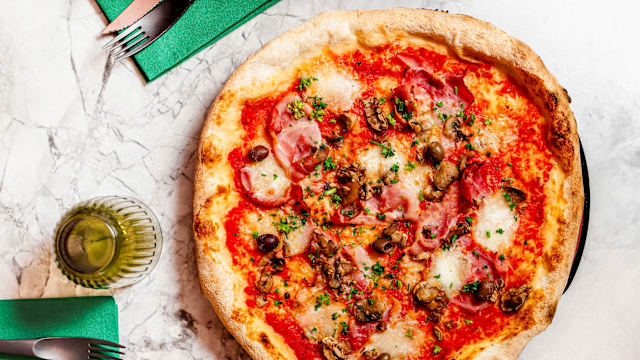 Sauce tomate au basilic, jambon aux herbes, fior di latte, poêlée de champignons de paris, persil, olives leccino