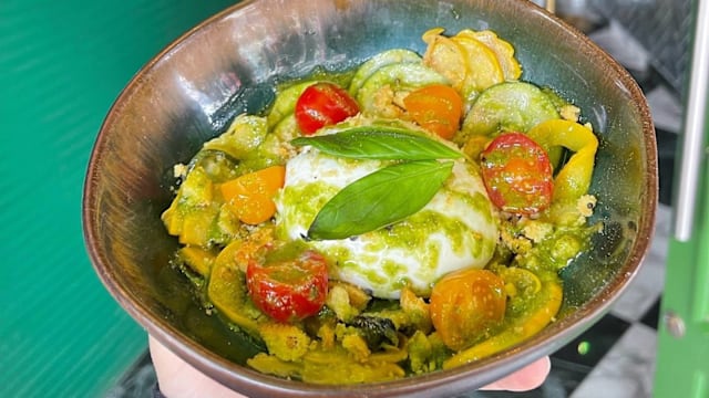 Burrata cœur au pesto, légumes grillés, crumble au parmigiano reggiano, pesto, pignons de pin, basilic frais