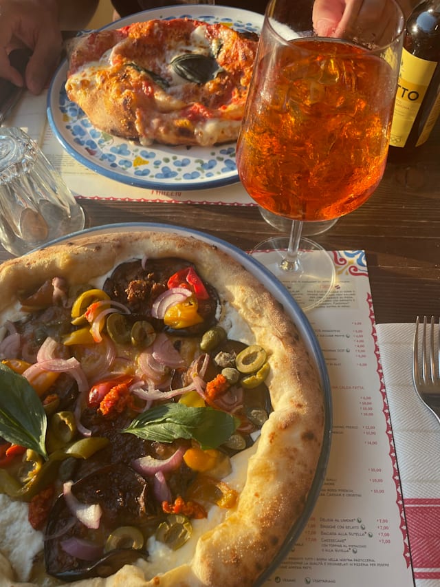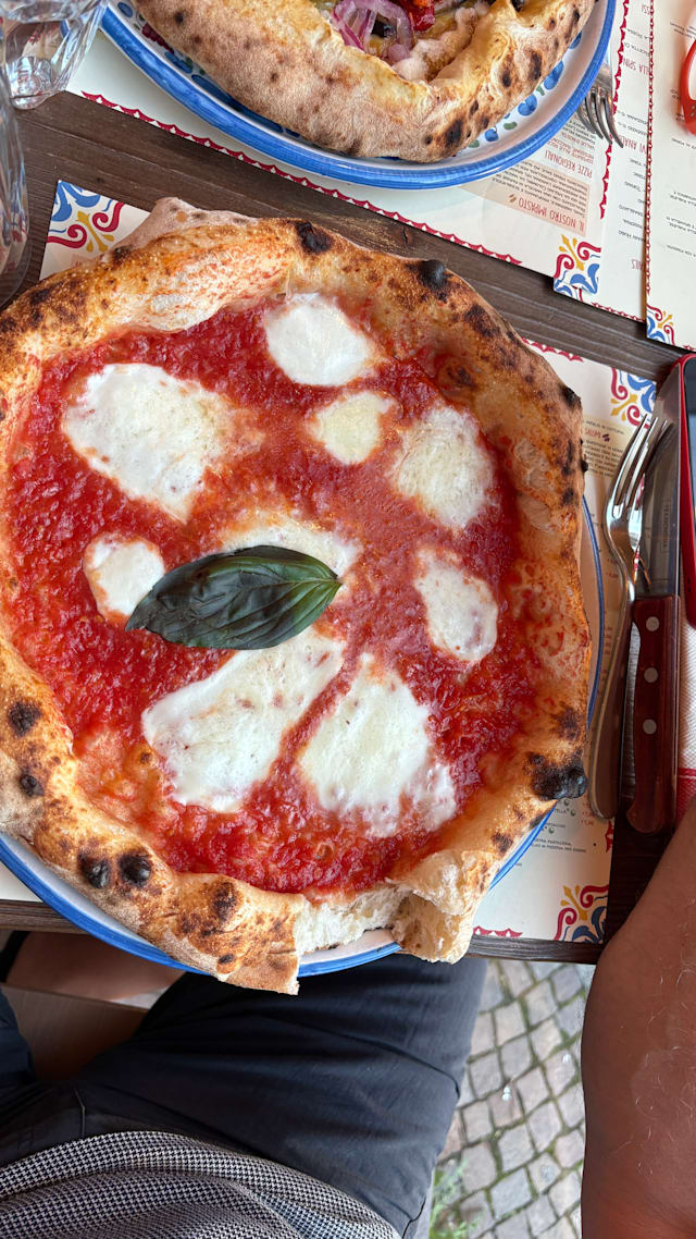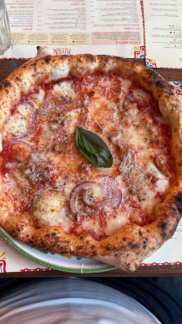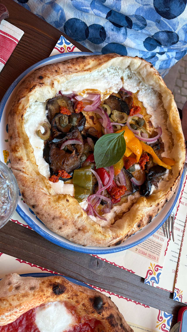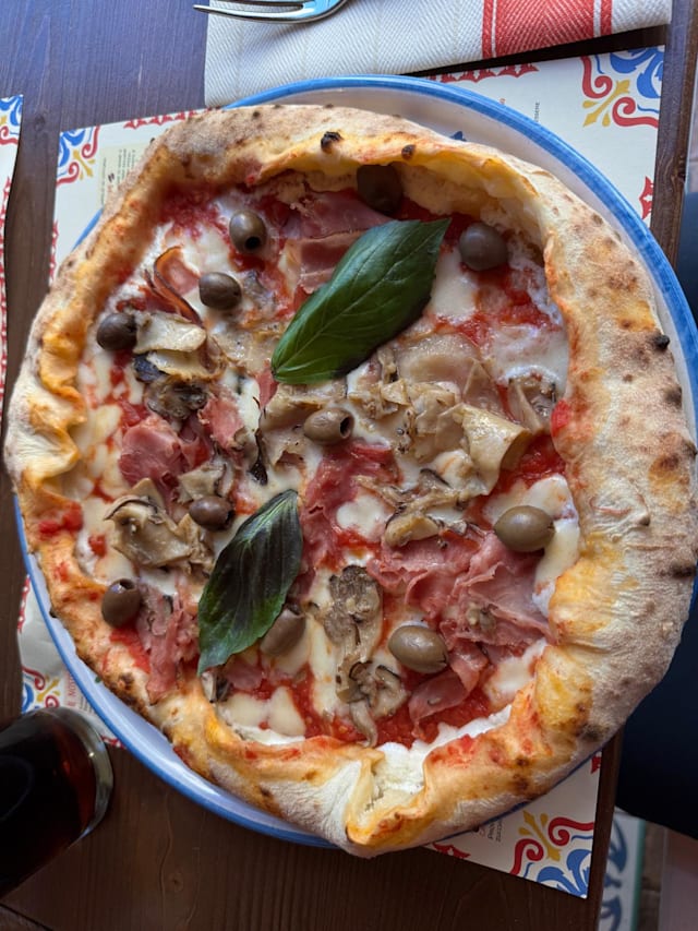 Pomodori pelati dall’agro sarnese, fior di latte dei monti lattari, funghi cardoncelli, prosciutto cotto alla brace e olive nere