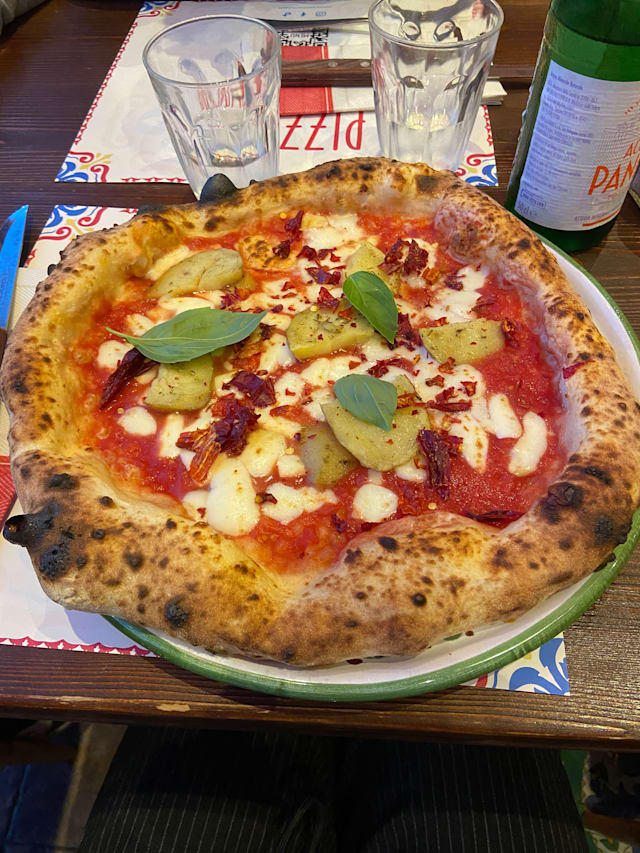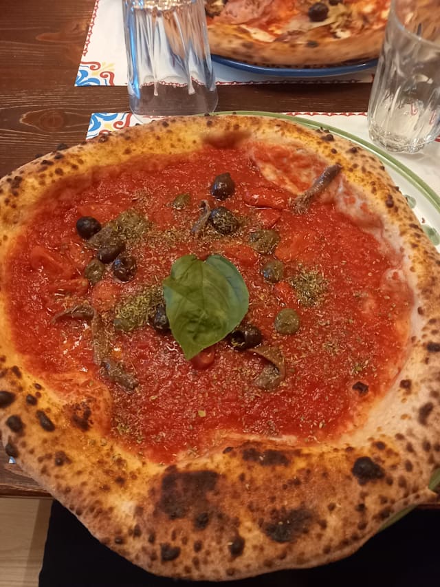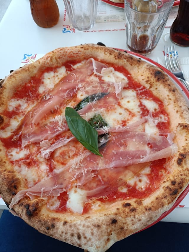 Pomodori pelati dall’agro sarnese, fior di latte dei monti lattari, funghi cardoncelli, prosciutto cotto alla brace e olive nere