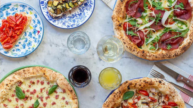 - Fior di latte, provola, gorgonzola DOP, grana DOP, pere, noci, olio EVO di puglia, basilico