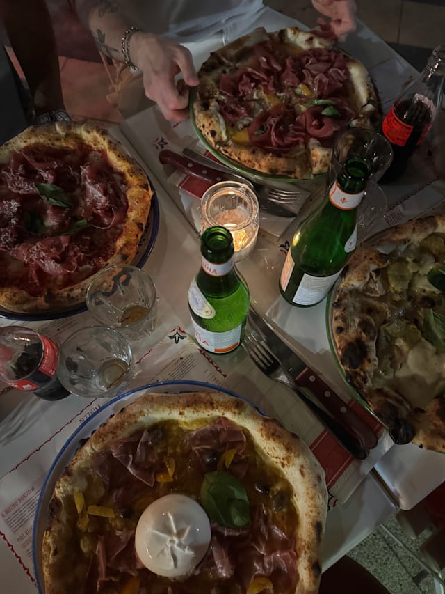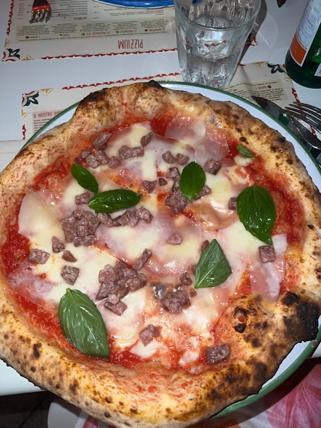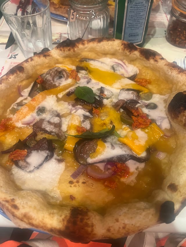 Pomodori pelati dall’agro sarnese, fior di latte dei monti lattari, funghi cardoncelli, prosciutto cotto alla brace e olive nere