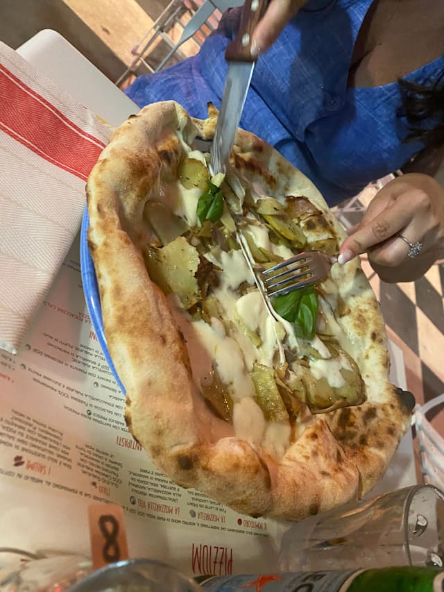 Fior di latte dei monti lattari, salsiccia di fassona 100% piemontese, olio al tartufo, pepe nero e cornicione ripieno di ricotta