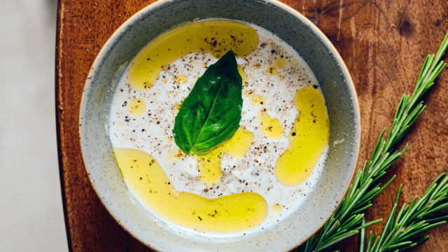 Fleur de lait, crème de truffe, champignons de paris, roquette, jambon blanc des frères huguier, huile de truffe blanche.