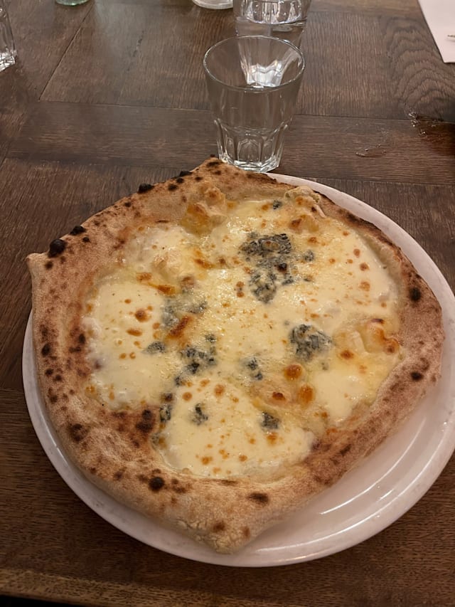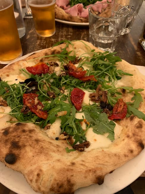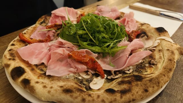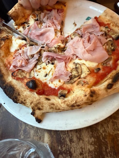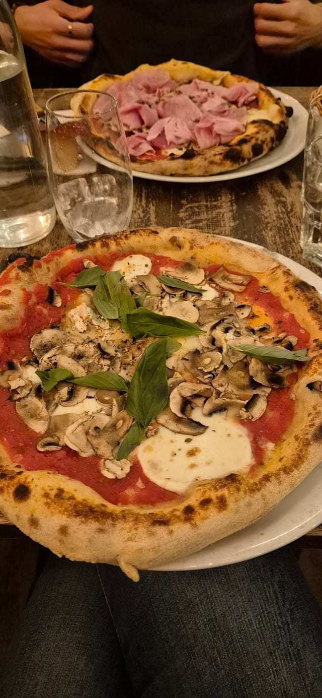 7/10This was my first time at this pizzeria. The service was attentive and ambiance quiet but good for a Sunday evening. I would say the pizzas tasted good with quality ingredients. However, the there was a lot of dough compared with the toppings, so the overall feeling was that they were quite dry. We ended up having to drink a lot of water to wash them down.
