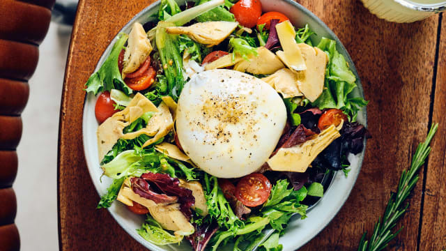 Tomates de provence, saucisse piquante d’aveyron, fleur de lait, artichauts marinés.