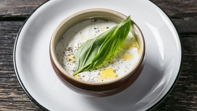 Fleur de lait, pesto de pistache, mortadelle de la maison victor, starcciatella, pisatches concassées