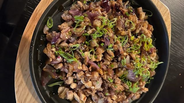 Grillé de porc haché au couteau mélangé avec des oignons, mariné avec de jus de calamansi et sauce soja; option pimenté