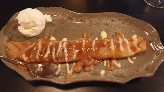Banane enroulée de pâte filo fait maison servis avec glace de vanille et caramel beurre salé fait maison