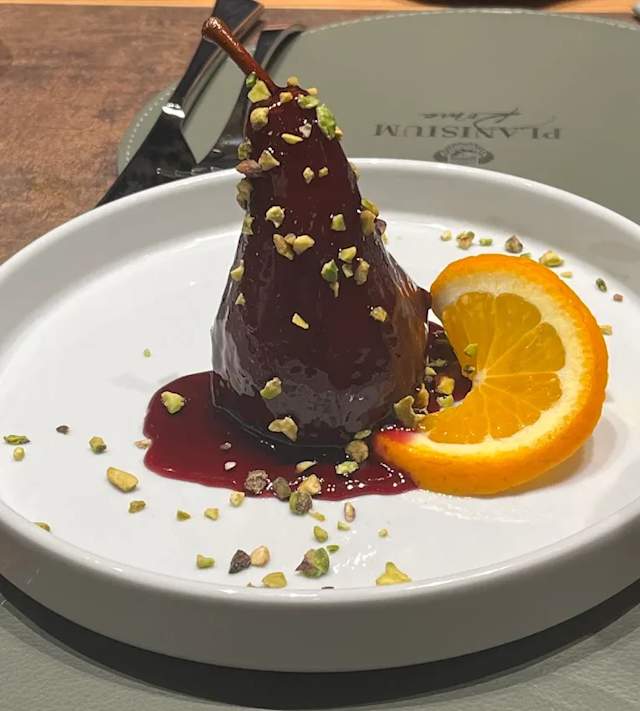 - Pera al vino rosso con granella di pistacchio