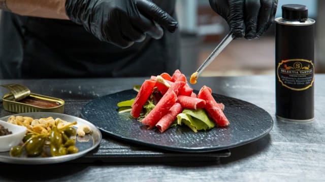 Di manzo toscano laccato al burro alle erbe e salsa al chianti-teriyaki