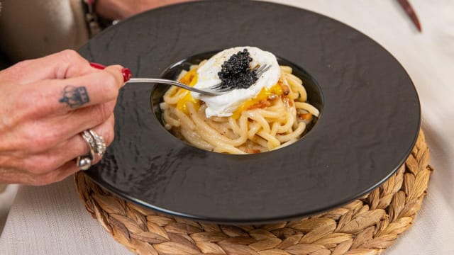 Con guanciale croccante, uovo pochè, pecorino romano e perlage di tartufo nero