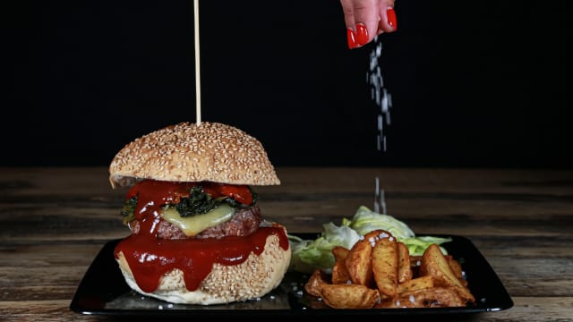 Hamburger, cicoria ripassata, pomodori secchi e salsa barbecue acompagniato