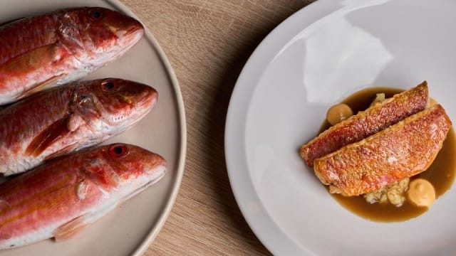 - Lubina de anzuelo a la meunière, setas salteadas y algas con 5g de caviar osetra