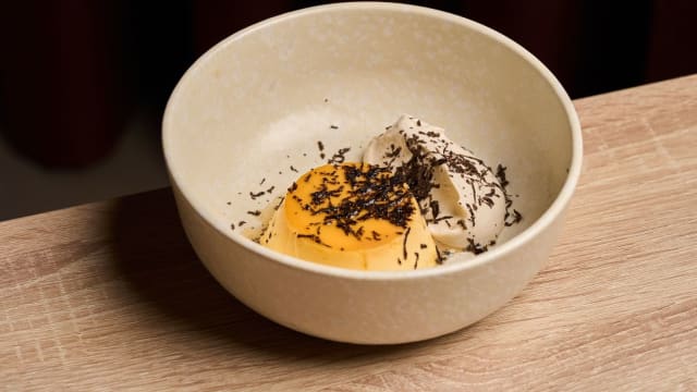 - Guisante lágrima del maresme consomé de morcilla seca y trufa