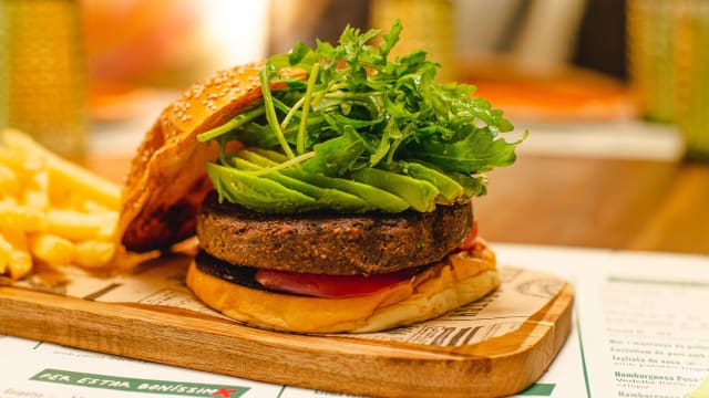 Pan brioche con burger beyond, tomate, cheddar, lechuga, cebolla, pepinillos y mayonesa de kimchi. ¡veganos, preguntad!