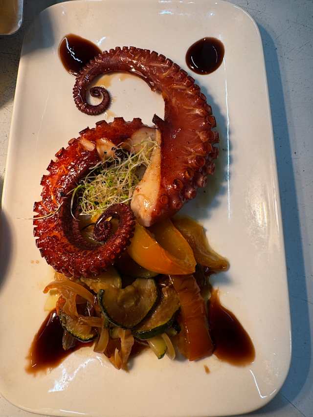 - Tentacules de poulpe fondant, caramélisés doucement pour une texture tendre et gourmande avec légumes du moment
