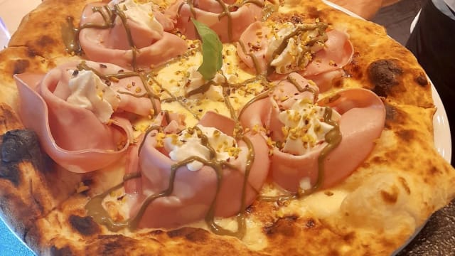 Mortadella, stracciata di bufala, pistacchi in crema, granella di pistacchi, olio evo