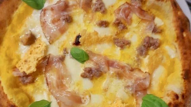Pizza al padellino semintegrale, stracciata di bufala aromatizzata allo zafferano di navelli, fiocco di prosciutto, tartufo fresco, olio evo
