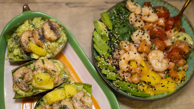 Ración de aguacates rellenos con piña y langostino aderezados con salsa Spicy Mayo, salsa Mango y semillas de amapola