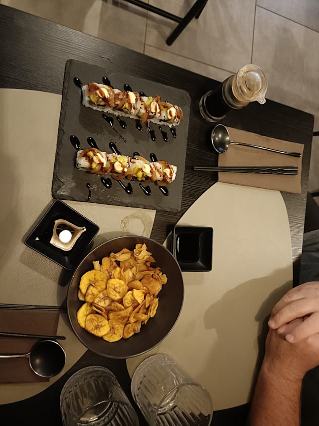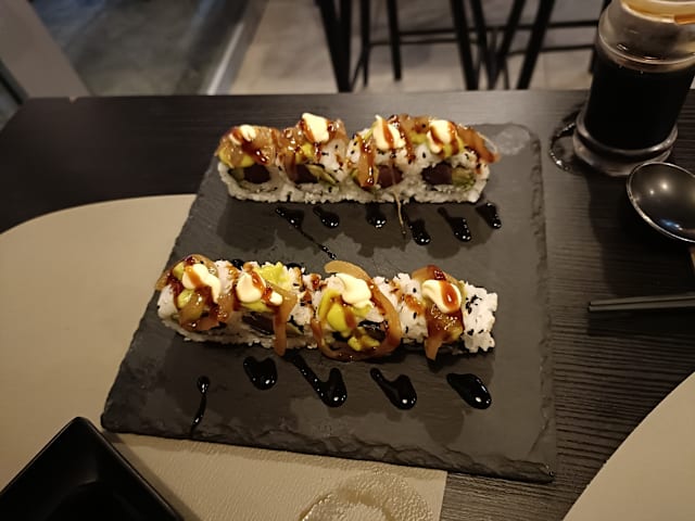 Alga nori, avocado, formaggio spalmabile, olive taggiasche, cipolla caramellata, glassa di aceto balsamico, tarallo sbriciolato e maionese