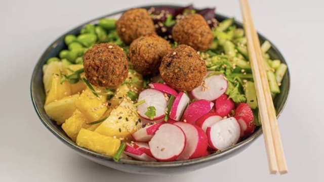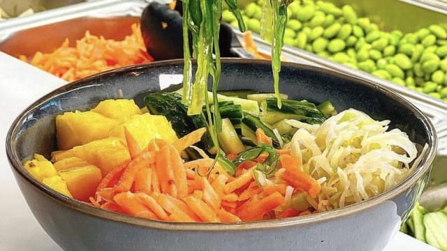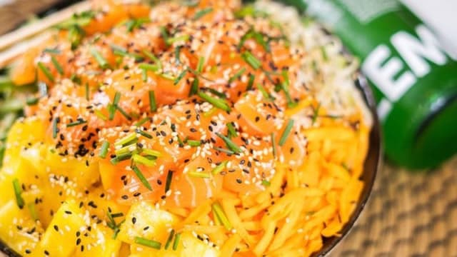 Saumon tataki • avocat • wakamé tomate cerise • betterave • lamelle de gingembre mariné • sauce spicy mayo • graines de sésame