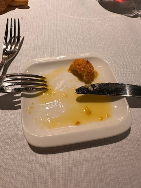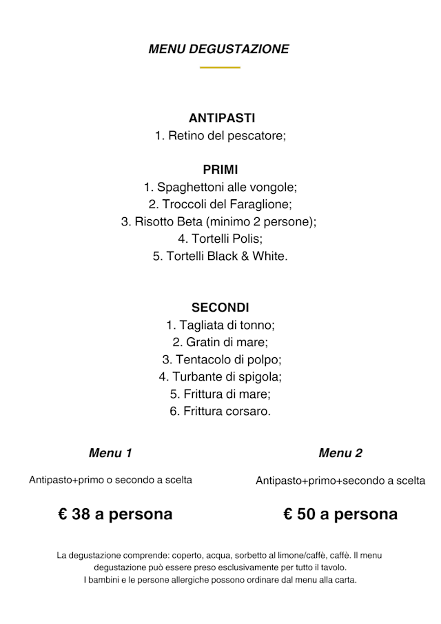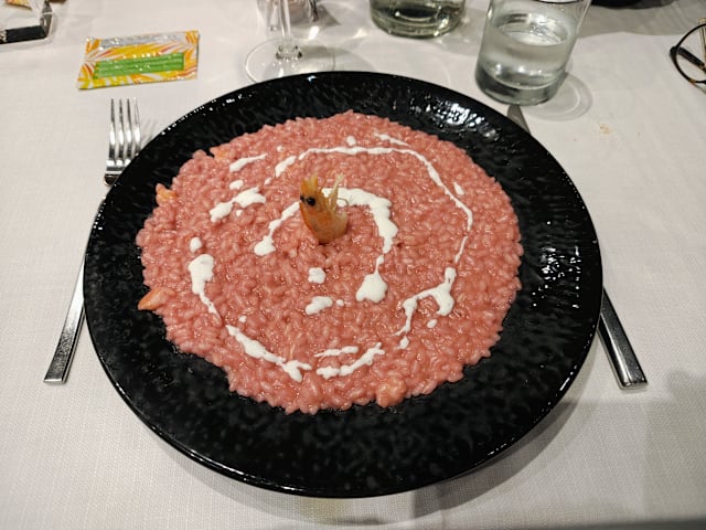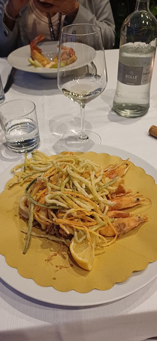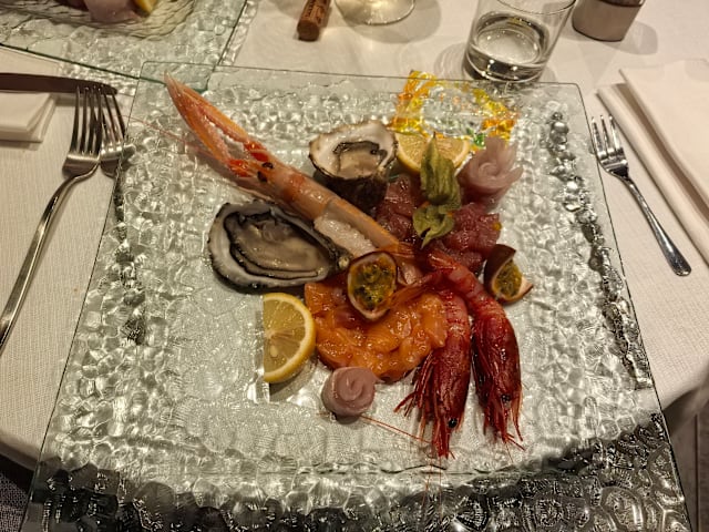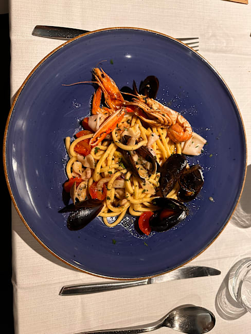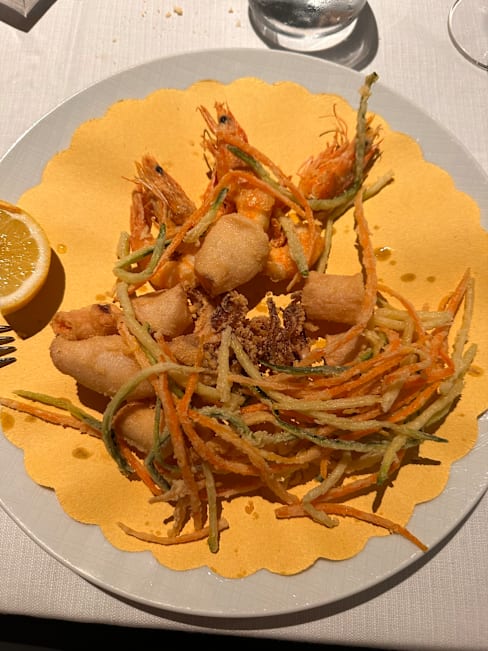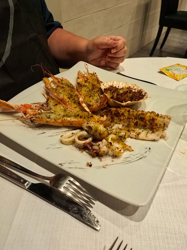 10/10Polis is an excellent dining space with a stylish ambiance kept in contrasting black/white interior. The menus are Italian only but our fantastic waiters readily translated what we needed to know and made a few recommendations along the way. We chose a three course menu and it was beautiful experience all the way through. Starters was a selection of fish in a variety of very tasty smaller bytes. Primi was spaghetti with seafood - very fresh and well prepared and secundi was shrimps squid and gamberone with julienned veggies deep fried tempura style. All very good. Dessert - sorbet of lemon or coffee and Italian coffee was included at no extra charge. All in all we had a delicious and enjoyable meal. Thank you Polis.