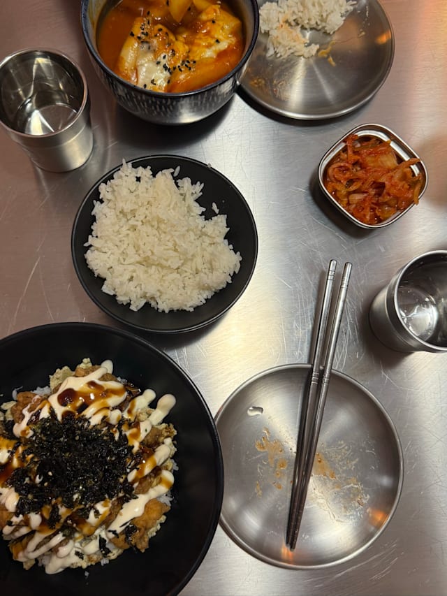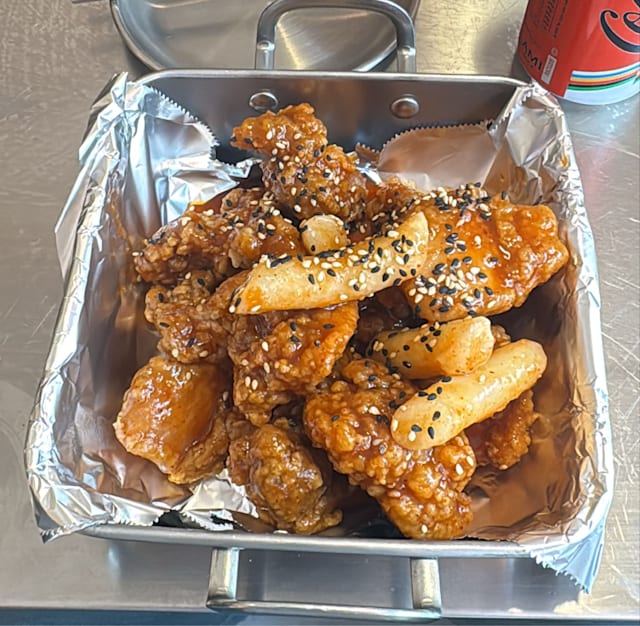 Pollo fritto croccante saporito e speziato dello stile coreano con gnocchi di riso