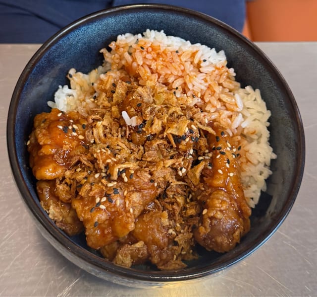Pollo fritto con la homemade salsa di soia dolce all’aglio e miele, inclusi gnocchi di riso