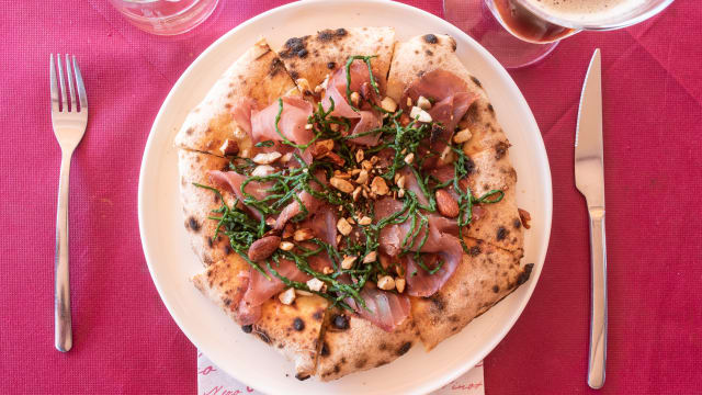 Polpa di pomodoro, mozzarella fior di latte, ‘Nduja, olive taggiasche, salamino piccante