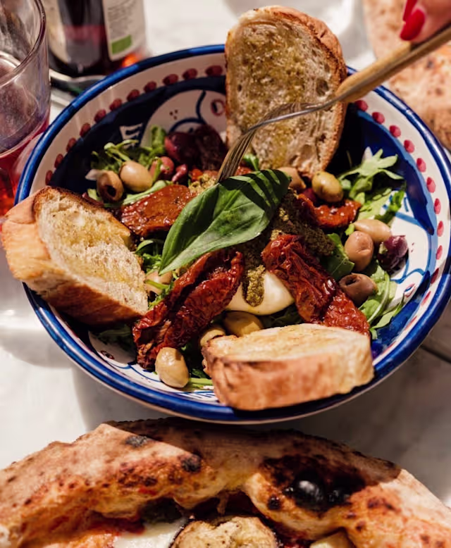 - Pesto de pistache maison, mortadelle, mozzarella agerola, copeaux de parmesan, basilic, grana padano, huile d'olive.