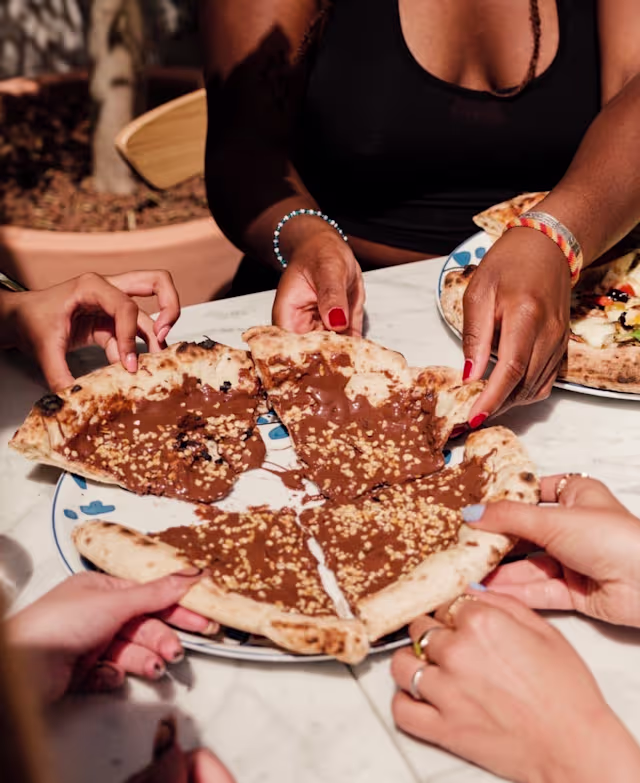 - Pizzeta sucrée dorée au four, crème pâtissière vanillée, sucre roux caramélisé au chalumeau et quenelle de glace vanille.