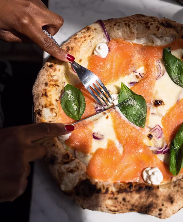 - Crème fraiche, oignons rouges caramélisés, saumon fumé, mozzarella agerola, ricotta, basilic, huile d'olive.