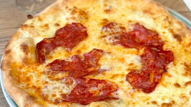 Sauce tomate, mozzarella, jambon, saucisse piquante, roquette, grana padano