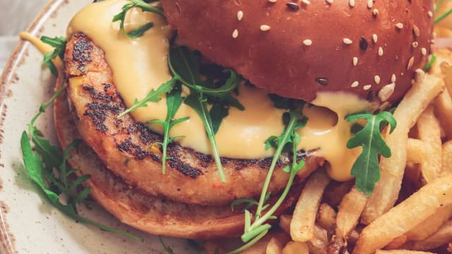 Steak veggie green hook, cheddar, guacamole. servis avec salade et frites