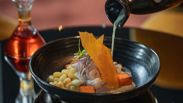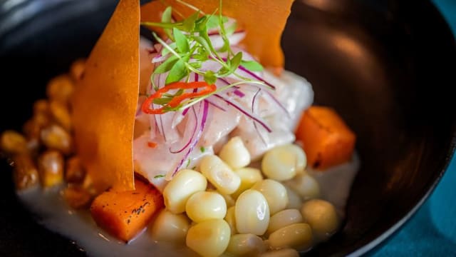 Wild Corvina fish, classic tiger's milk, canchita, corn, sweet potato textures, red onion, and cilantro oil