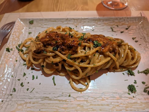 7.5/10Ponticello street food sampler was good, including the Milza and sheep intestine. Well prepared. Had the special Spaghetti with Sea Urchin. I'm a very ambitious eater, but didn't enjoy the urchin. Bitter and won't try again.