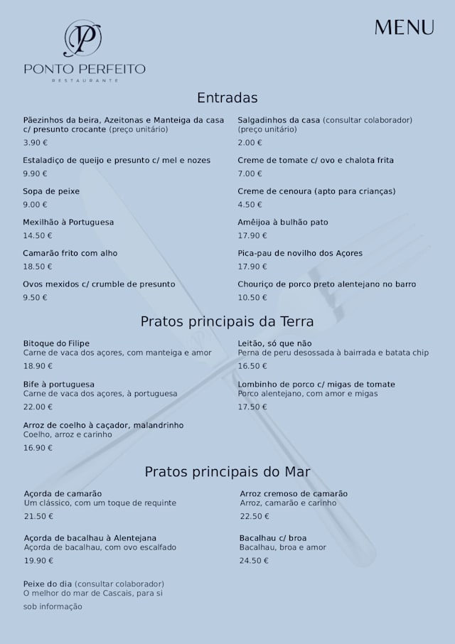 10/10+1Incredible food, we went early, the staff was AMAZING, and the food was so good we could not shut up about it for the whole meal, presentation was lovely, and the ambience was 10/10, traditional portuguese music, not too loud. The sangria was to die for, and the octopus was divine, the menu on “The Fork” is small because when you arrive the restaurant will present you with both the menu you see here, and a new one, which includes whatever freshest ingredients the ocean provided for the day, and you can REALLY taste the difference. I grew up in a family of chefs, and i can say that this small restaurant is a hidden pearl in our backyards, 10/10 i will definitely be going again
