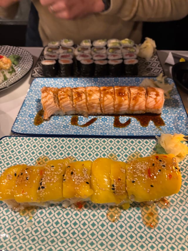 California saumon cuit, cheese, panko, spicy mayo, ciboulette thaï