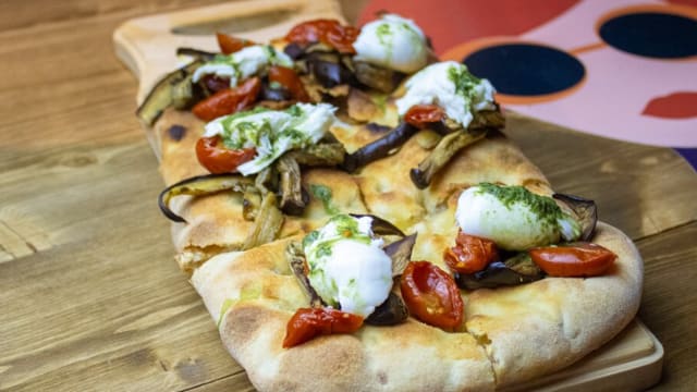 Melanzana, pomodorino infornato, bufala, salsa di basilico