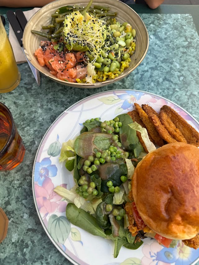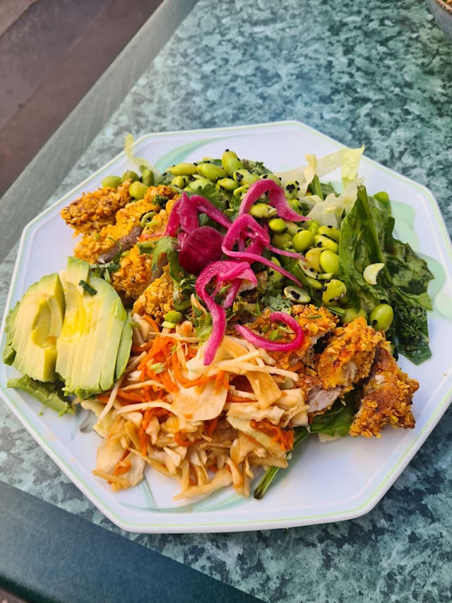 Bun • poulet croustillant, cébette et coriandre • halloumi • pickles de chou rouge • persil • salsa verde. Accompagnement: kale & edamame, citron vert & dukkah • wedges potatoes salty