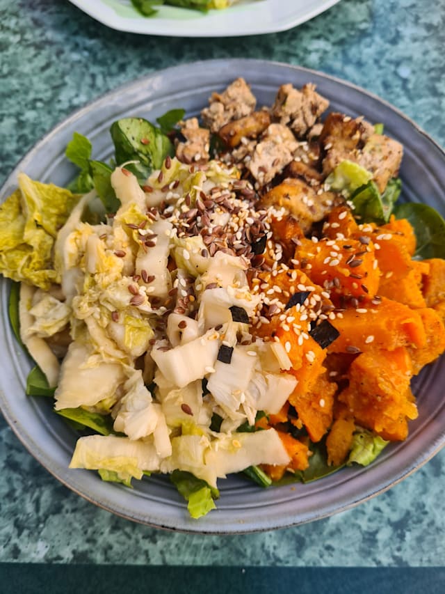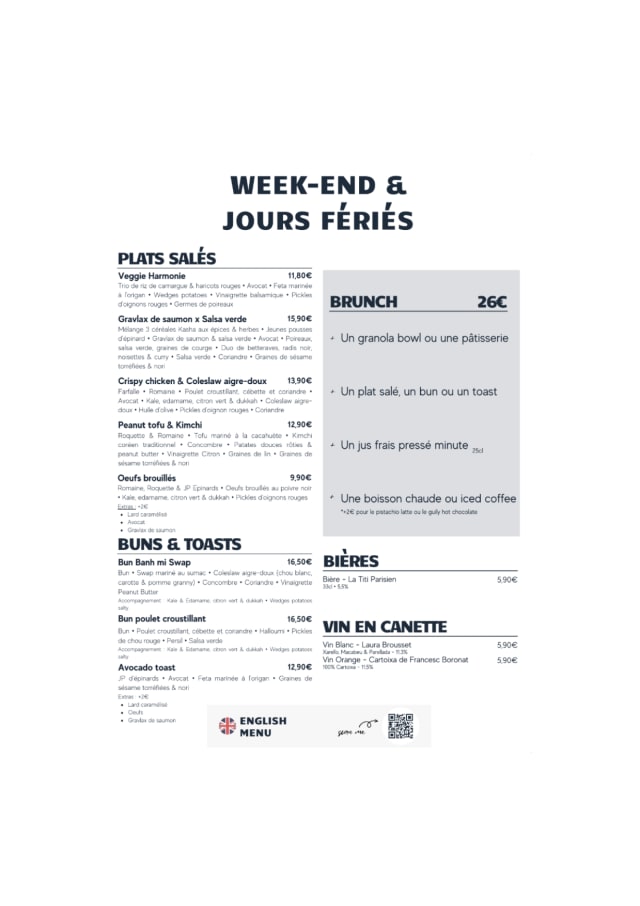 Bun • swap mariné au sumac • coleslaw aigre-doux (chou blanc. Carotte & pomme granny) • concombre • coriandre • vinaigrette peanut butter. Accompagnement: kale & edamame, citron vert & dukkah • wedges potatoes salty