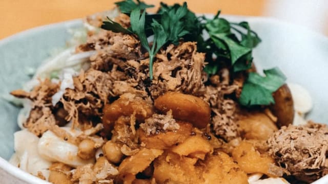 Riz blanc et complet citronné • poulet à la moutarde de dijon • légumes d'hiver façon pot-au-feu • choux de bruxelles caramelisé & vinaigré • champi de paris • moutarde au yacon • persil • oignons frits